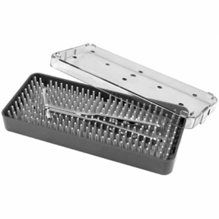 autoclavable plastic with silicone mat base, lid and mat are perforated for steam penetration outside dimensions: 61/4 x 23/4 x 1 (160 x 70 x 25mm) Accommodates two or three microsurgical instruments.